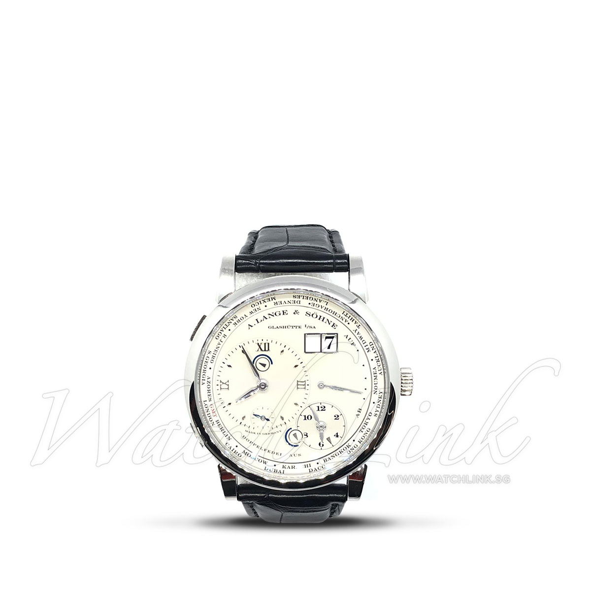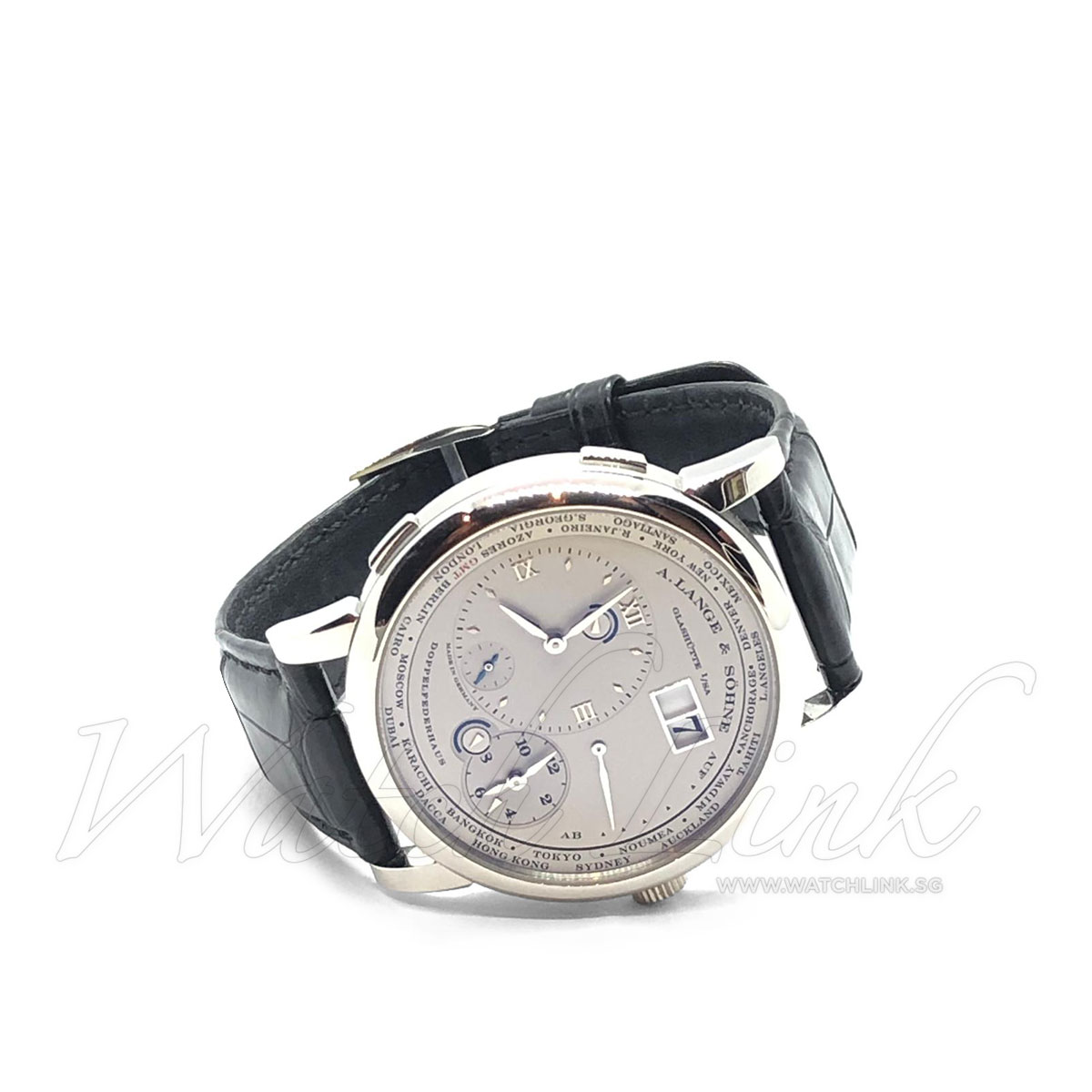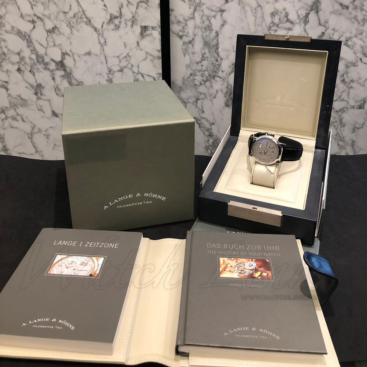 Mint condition, full set box and papers, dated Dec 2010. The German watch brand A.lange & sohne created a beautiful A.lange 1 Time Zone. Main dial displaying the home time for the wearer or the time of country they are visiting. Time zone shows the day and night phases using small arrows.